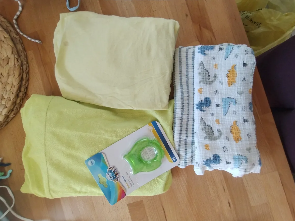 Darujem 1x nepremokavá plachta na postieľku, 1x plachta na postieľku , 2x látkové plienky + úplne nové chladiace hryzátko . Na plachte je malinký fľak, inak je všetko bez poškodenia 🙂
