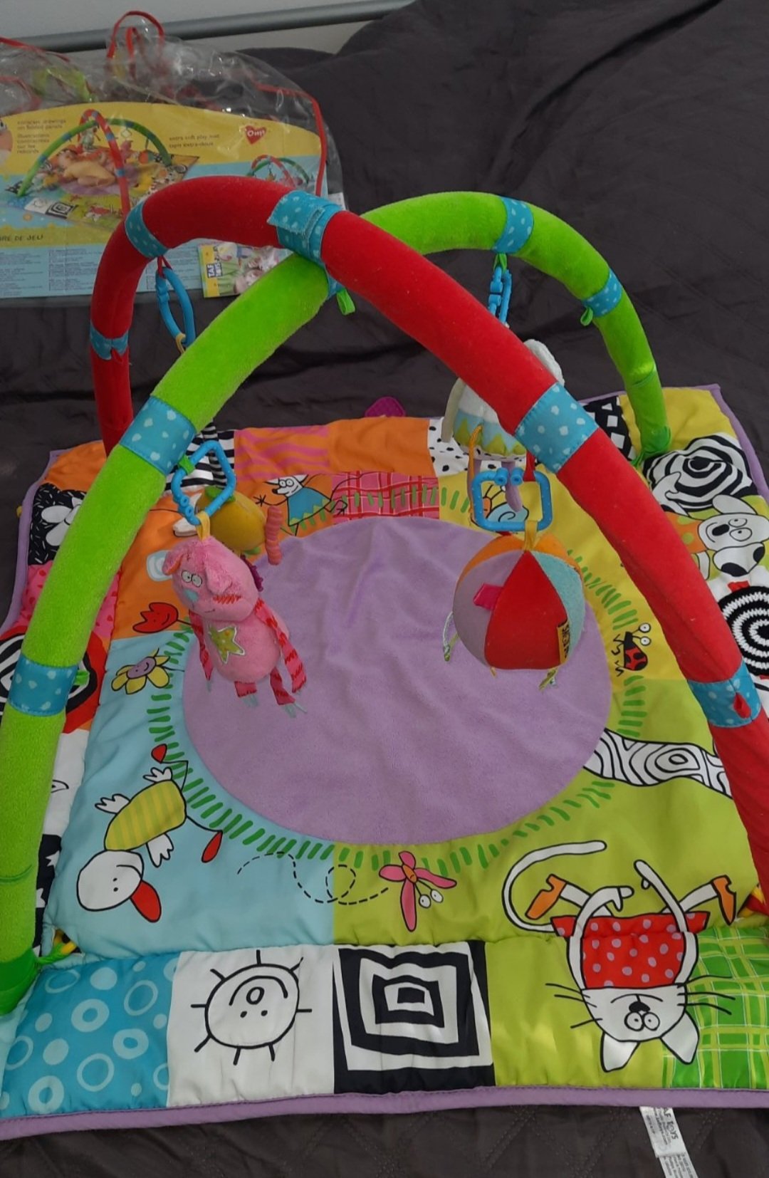 používaná hracia dečka s hračkami. zrkadielko tam už nie je, bolo prasknute, tak som ho odtial vystrihla a uháčkovala bieločierny kruh.